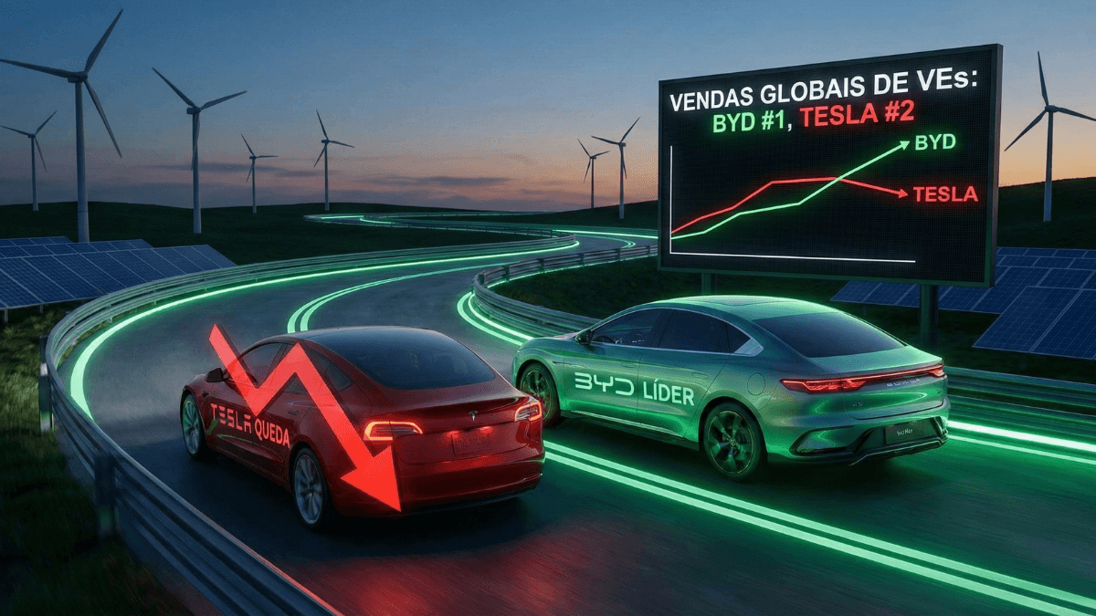 A BYD é a nova líder mundial. Em 2025, a montadora chinesa vendeu 2,26 milhões de veículos elétricos, superando a Tesla, que vendeu 1,64 milhão de unidades no mesmo período.